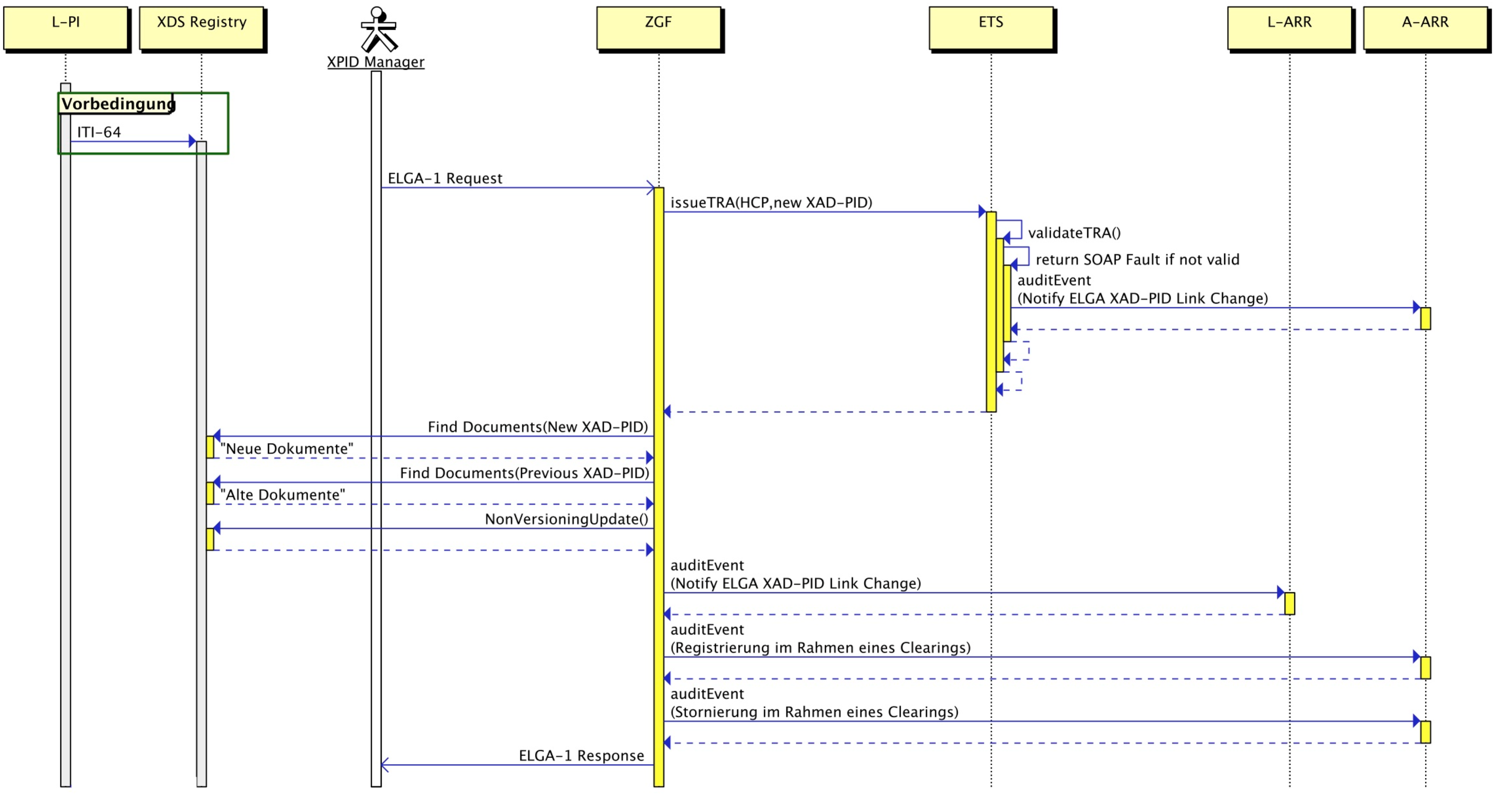 Alle Audit Nachrichten beinhalten eine eindeutige Identifikation, die für alle Subtransaktionen identisch ist. Es wird die SOAP MessageID der ersten initiierenden SOAP Nachricht einer gesamten Transaktionskette im SOAP Header an alle folgenden Transaktionsziele (Z-PI, GDA-I, ELGA-Bereiche etc.) mit übergeben. Diese Identifikation wird von allen Services in die Audit Nachrichten übernommen. Wird vom ELGA Berechtigungssystem bereits eine Transaktionsklammer empfangen (Interface 2: Transaktionsklammer), wird diese für alle weiteren SOAP Nachrichten weiterverwendet. Die Transaktionsklammer wird derzeit in allen Requests auch im http-Header geführt.